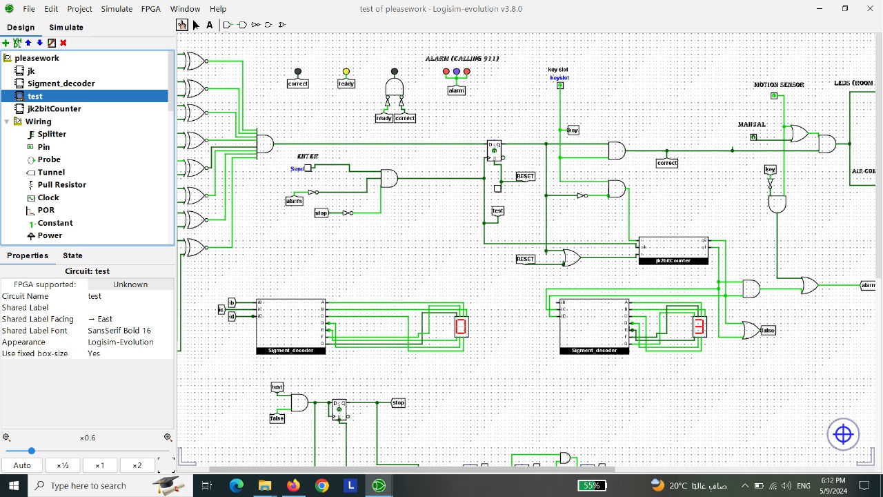 Using logic gates and logic components we created a security System. You need a key and a password to open the door. If the pass was wrong 3 times the police will come and if the motion sensor detected a movment inside while the house if empty the police will come.